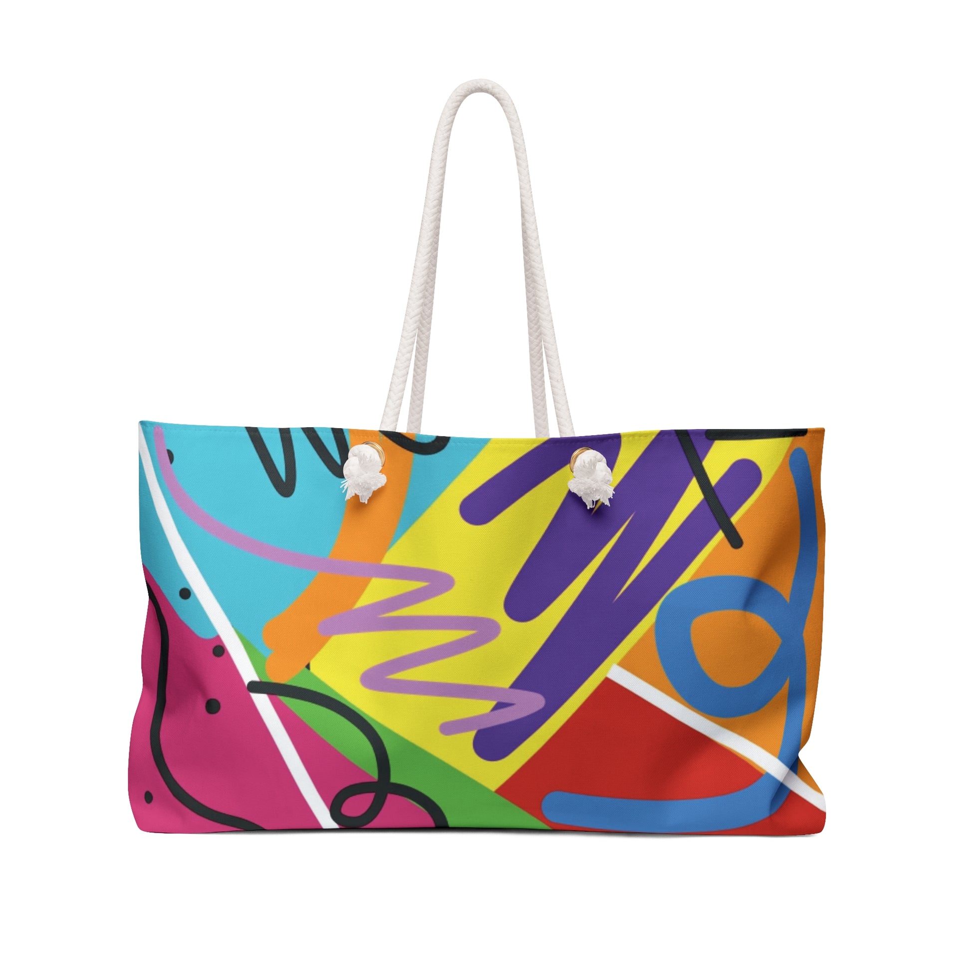 Talk about being BOLD! This bag is that and more and will surely boost your mood and confidence with such vibrant colors and unique abstract art. Our oversized Be Bold Weekender Tote is perfect for any day of the week! It is durable, can be easily held by its thick rope handles, and will hold many of your personal items. Made from 100% spun polyester.