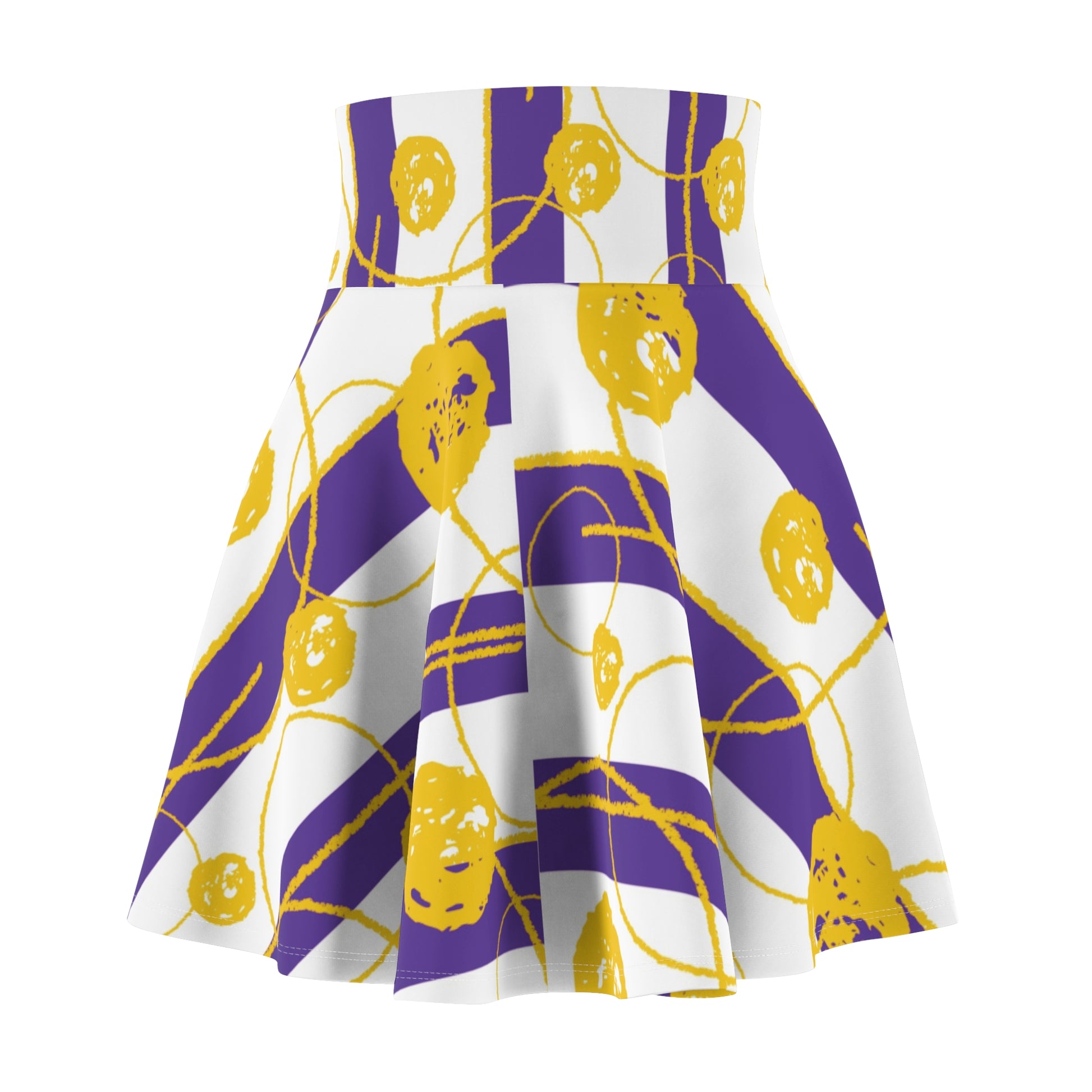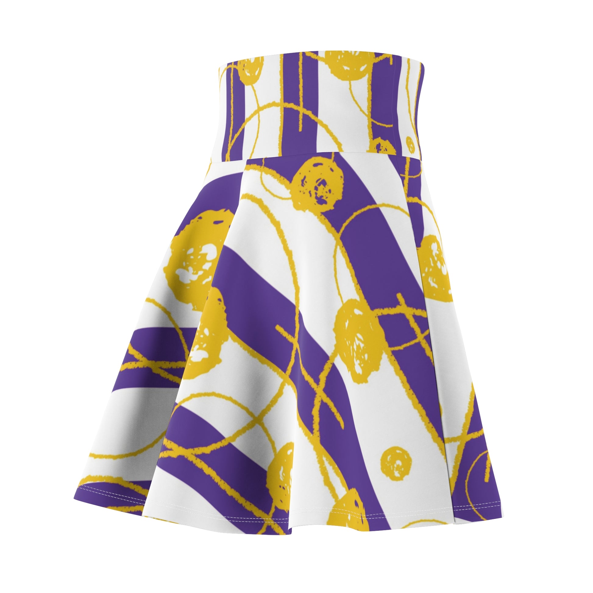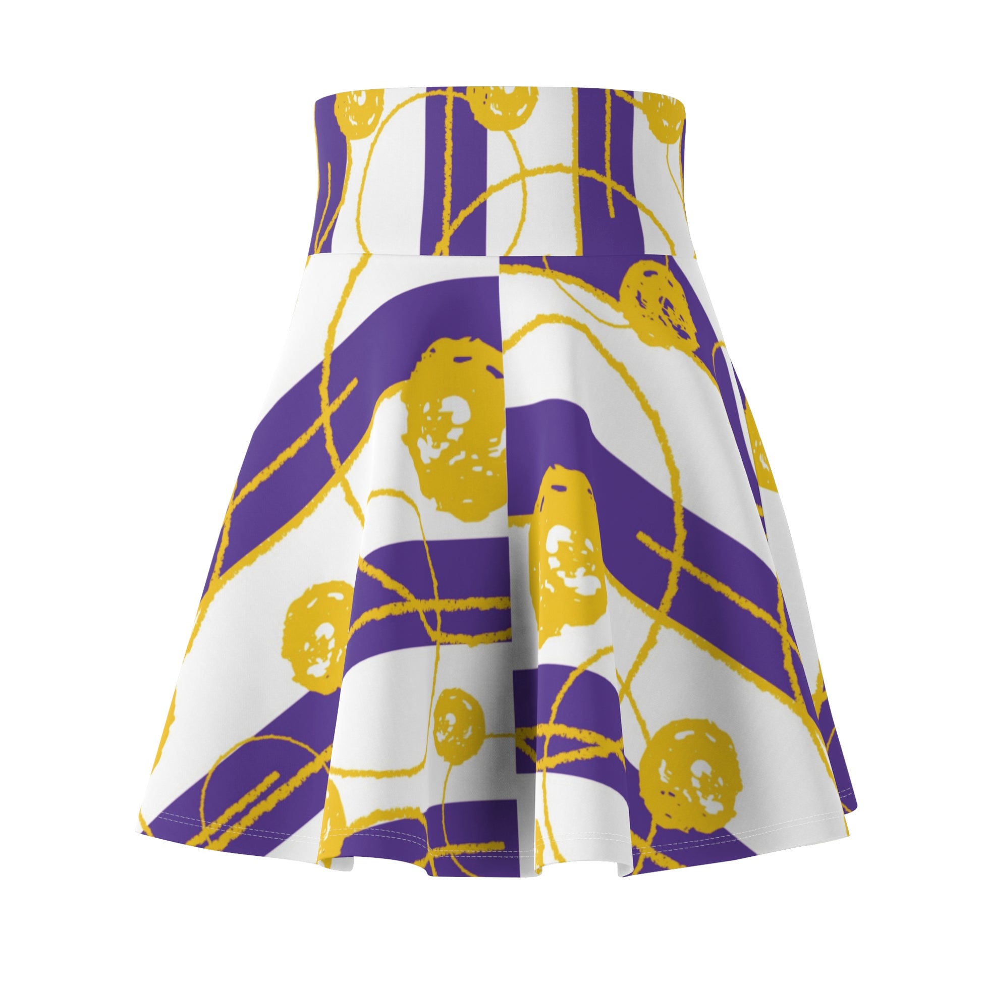 A stylish and unique skater skirt featuring a purple and gold abstract design, perfect for adding a pop of color to your outfit. This skirt is versatile and can be dressed up or down, making it ideal for casual outings or special occasions. A great addition to any woman's wardrobe, especially those who love vibrant colors and contemporary prints. Perfect for holidays, games, parties, and everyday wear.
